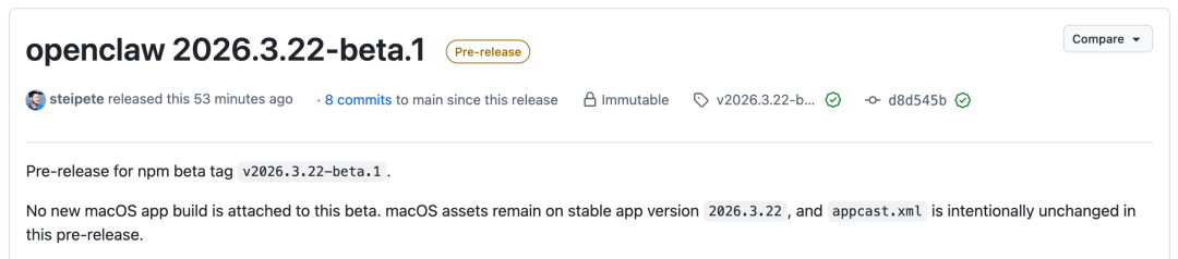 GitHub发布地址:https://github.com/openclaw/openclaw/releases/tag/v2026.3.22-beta.1