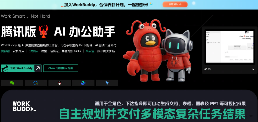 但如果你坐在电脑前,指望它帮你干重活,会觉得它有点“单薄”。这就轮到 WorkBuddy 出场了。