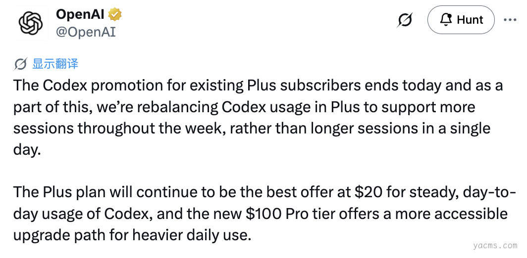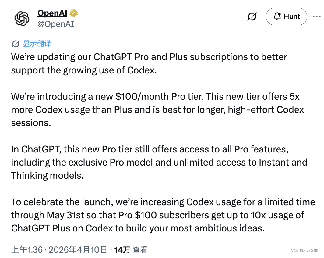 刚刚,OpenAI 官方宣布推出新的 $100/月 Pro 档!
