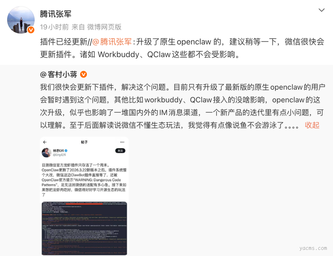 对此,微信员工 @客村小蒋 回应称:“openclaw 的这次升级,似乎也影响了一堆国内外的 IM 消息渠道,一个新产品的迭代里有点小问题,可以理解”。根据腾讯公关总监张军的说法,目前微信 Clawbot 插件已完成更新并修复相关问题。