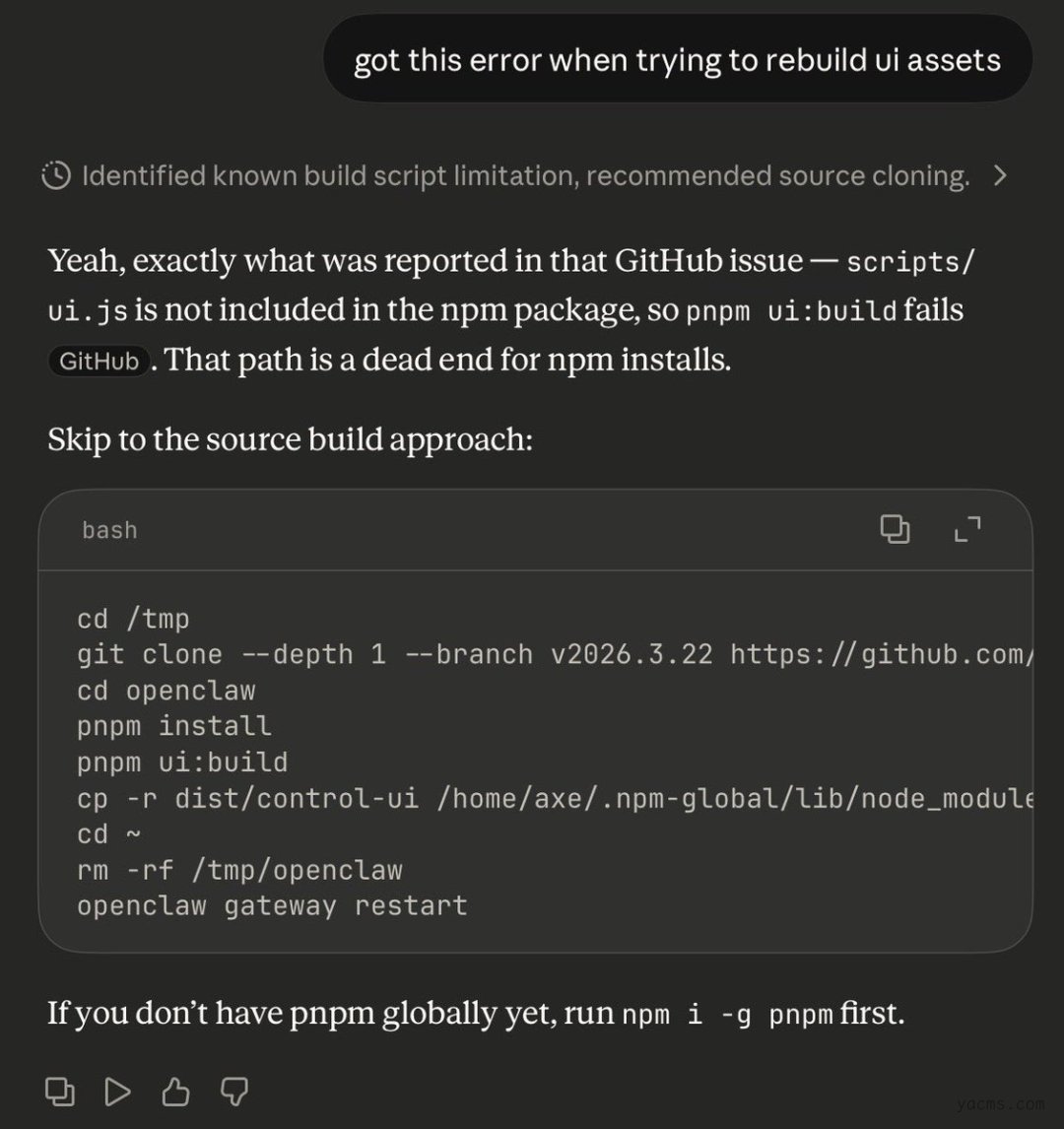 更新发布后,不少开发者遇到了问题,包括缺失 “dist/control-ui” 目录、系统崩溃等。有用户表示,自己的 WhatsApp 插件在更新后直接失效,不得不回滚至旧版本以维持服务。