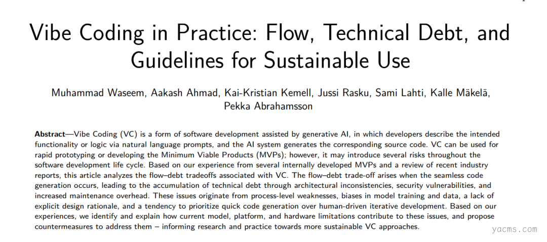 而此次更新事故也恰好为 Vibe Coding 的未来发展敲响了警钟。正如由高校研究者和行业实践团队共同发布的论文《Vibe Coding in Practice: Flow, Technical Debt, and Guidelines for Sustainable Use》中所指出的:Vibe Coding 在前期探索阶段的确高效,但许多团队会不知不觉地将“适合快速试错”误认为“适合一路推进到生产环境”,而这往往正是技术债务失控的起点。