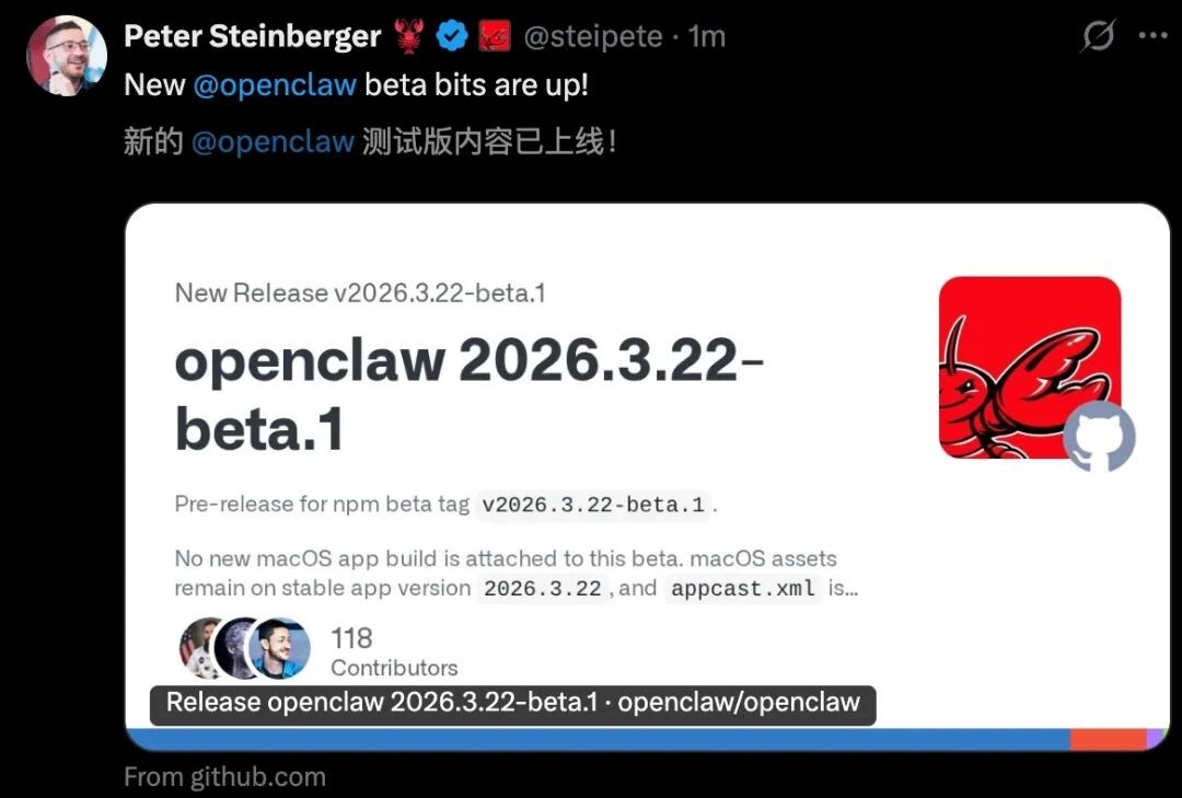 项目负责人Peter Steinberger正式宣布,OpenClaw「2026.3.22-beta.1」预览版现已上线。