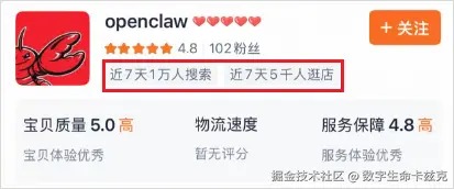 淘宝上一个我搜到的OpenClaw的店铺,近7天有1万人搜索,5千人进入了店铺。