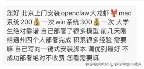 还有另一个非常魔幻的事。就是OpenClaw收费上门安装。