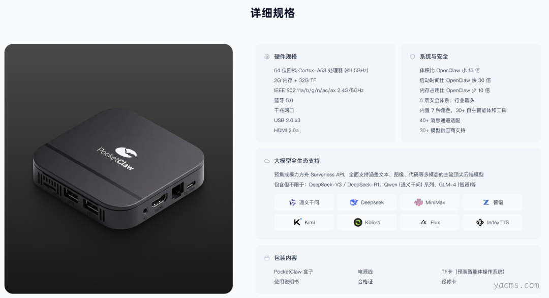 硬件配置方面,PocketClaw 搭载 64 位四核 Cortex-A53 处理器,配备 2GB 内存与 32GB TF 卡存储,支持双频 Wi-Fi、蓝牙 5.0、千兆网口、3 个 USB 2.0 接口及 HDMI 2.0a 输出,足以满足日常连接、部署及外设扩展需求。