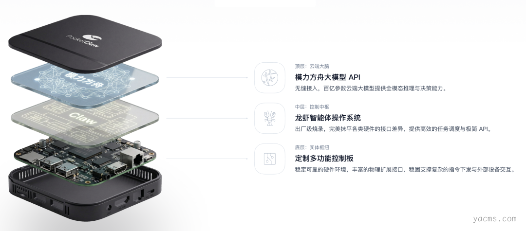 “龙虾智能体操作系统”已在出厂时完成预装,其核心模型能力通过调用模力方舟云端 API 实现。硬件足够轻量,系统提前部署完毕,模型能力随设备启动即可接入。